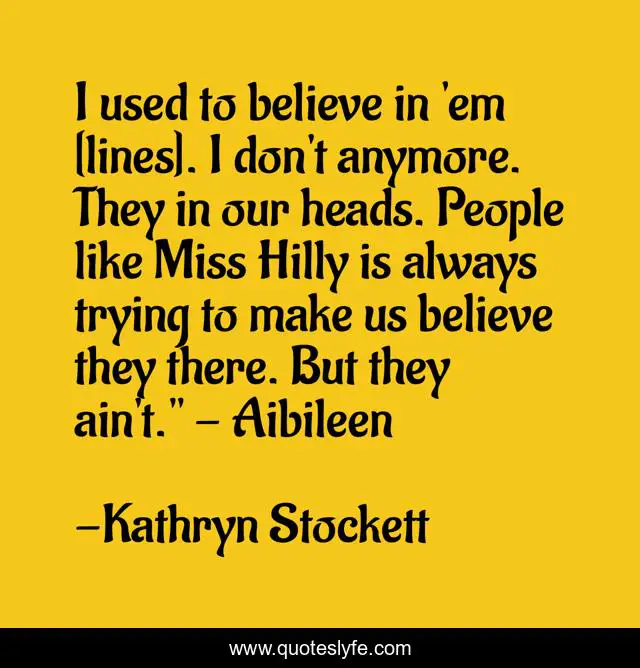 This page presents the quote "I used to believe in 'em [lines]. I don't anymore. They in our heads. People like Miss Hilly is always trying to make us believe they there. But they ain't." - Aibileen". Author of this quote is Kathryn Stockett. This quote is about color, society, race,.