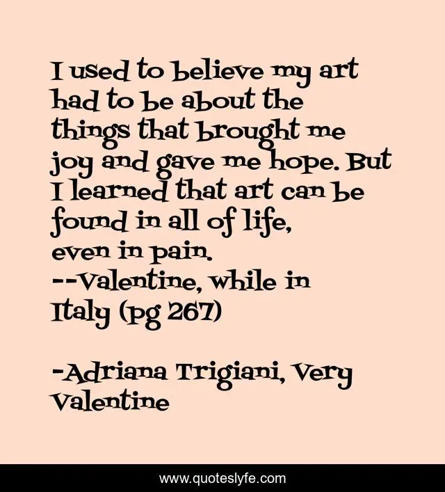 This page presents the quote "I used to believe my art had to be about the things that brought me joy and gave me hope. But I learned that art can be found in all of life, even in pain. --Valentine, while in Italy (pg 267)". Author of this quote is Adriana Trigiani, Very Valentine. This quote is about joy, pain, hope,.