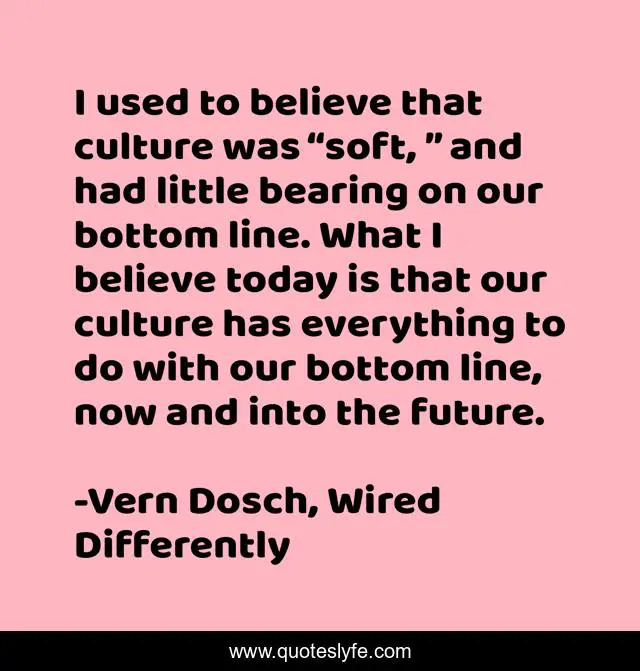 This page presents the quote "I used to believe that culture was “soft, ” and had little bearing on our bottom line. What I believe today is that our culture has everything to do with our bottom line, now and into the future.". Author of this quote is Vern Dosch, Wired Differently. This quote is about culture, business-culture, business, bottom-line,.