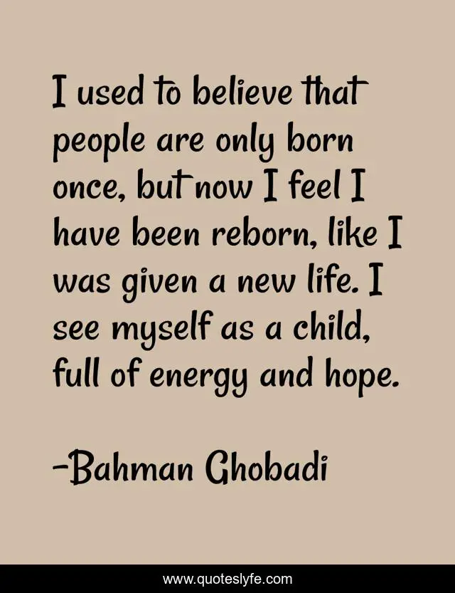 This page presents the quote "I used to believe that people are only born once, but now I feel I have been reborn, like I was given a new life. I see myself as a child, full of energy and hope.". Author of this quote is Bahman Ghobadi. This quote is about life, myself, child,.