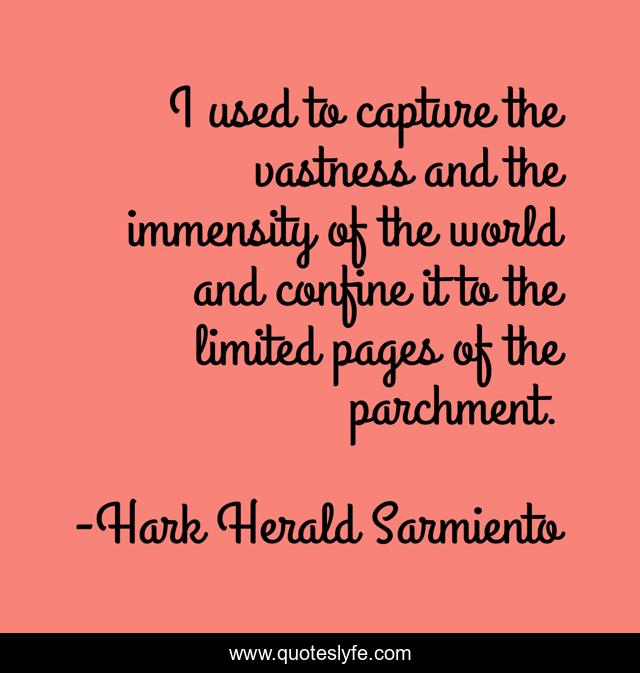This page presents the quote "I used to capture the vastness and the immensity of the world and confine it to the limited pages of the parchment.". Author of this quote is Hark Herald Sarmiento. This quote is about photographs, capture, explorer, vastness, confinement, limited-atonement, world, writing, parchment,.