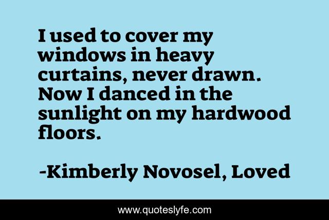 This page presents the quote "I used to cover my windows in heavy curtains, never drawn. Now I danced in the sunlight on my hardwood floors.". Author of this quote is Kimberly Novosel, Loved. This quote is about curtains, love, darkness, hardwood-floors, light, sunshine, sadness, affection,.