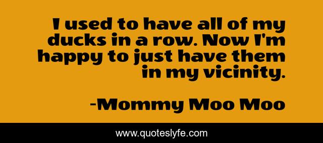 This page presents the quote "I used to have all of my ducks in a row. Now I'm happy to just have them in my vicinity.". Author of this quote is Mommy Moo Moo. This quote is about breathe, calmness-and-attitude, expectations, managing-stress,.