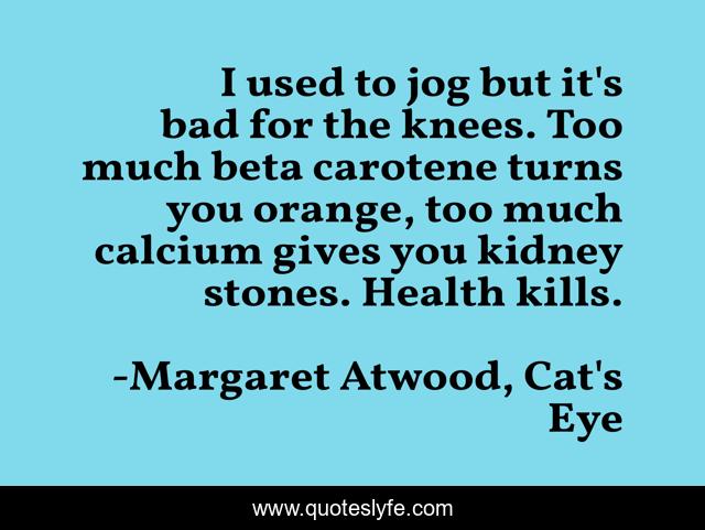 This page presents the quote "I used to jog but it's bad for the knees. Too much beta carotene turns you orange, too much calcium gives you kidney stones. Health kills.". Author of this quote is Margaret Atwood, Cat's Eye. This quote is about health, humor, sarcasm,.