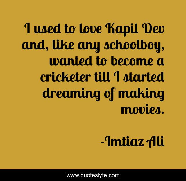 This page presents the quote "I used to love Kapil Dev and, like any schoolboy, wanted to become a cricketer till I started dreaming of making movies.". Author of this quote is Imtiaz Ali. This quote is about started, love, affection, dreaming,.