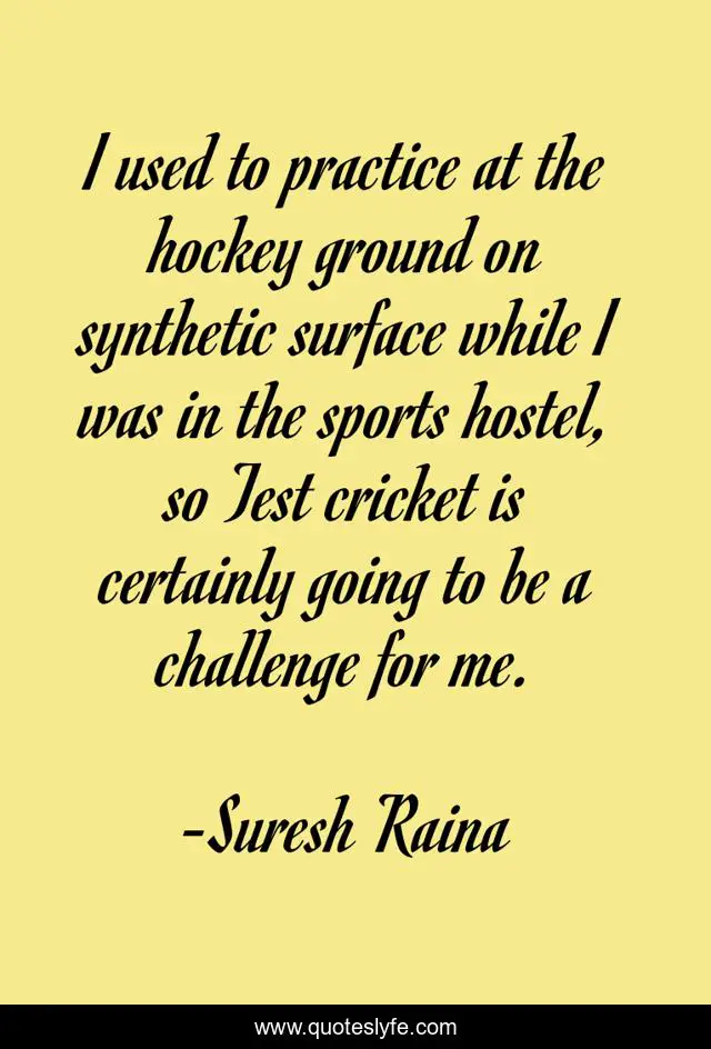 This page presents the quote "I used to practice at the hockey ground on synthetic surface while I was in the sports hostel, so Test cricket is certainly going to be a challenge for me.". Author of this quote is Suresh Raina. This quote is about me, challenge, hockey,.