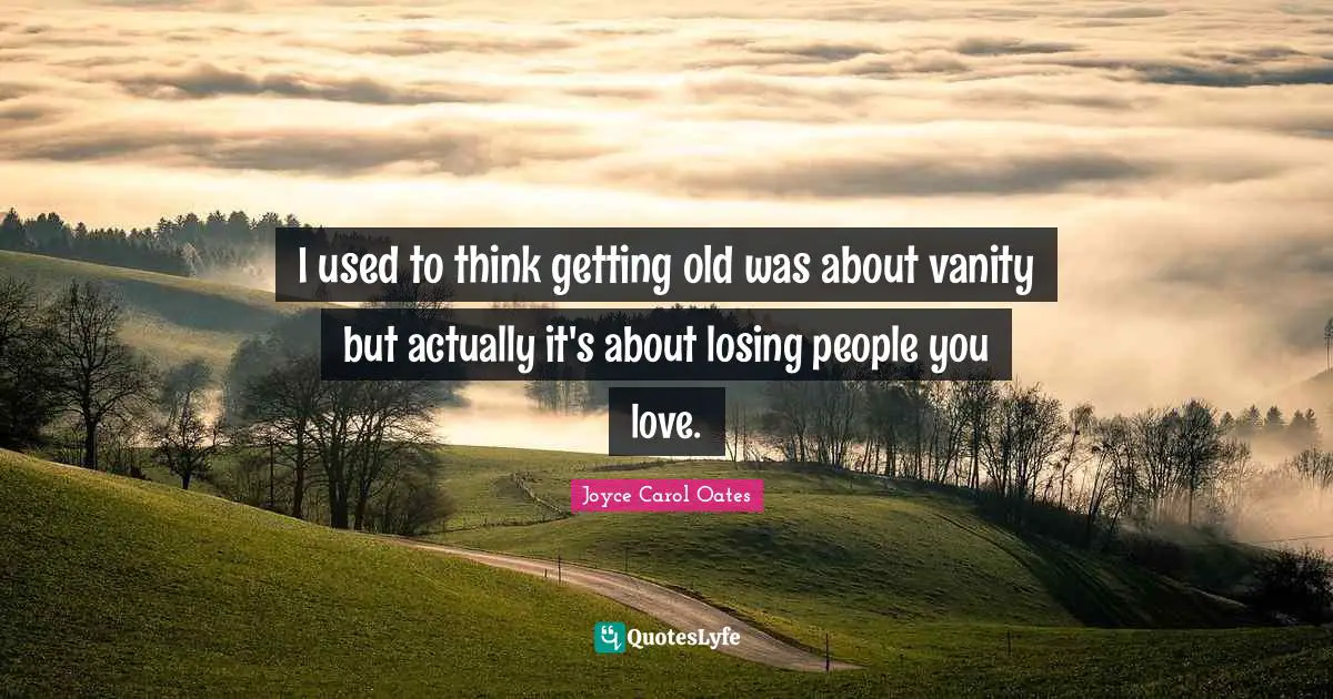 This page presents the quote "I used to think getting old was about vanity but actually it's about losing people you love.". Author of this quote is Joyce Carol Oates. This quote is about love, used, people, wrinkles, getting old, thinking, losing, vanity,.