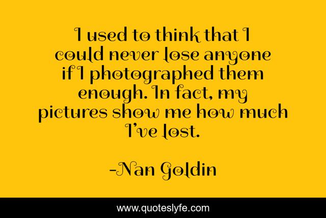 This page presents the quote "I used to think that I could never lose anyone if I photographed them enough. In fact, my pictures show me how much I’ve lost.". Author of this quote is Nan Goldin. This quote is about loss, photography, art, lost-love,.