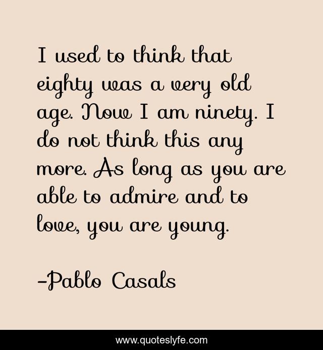 This page presents the quote "I used to think that eighty was a very old age. Now I am ninety. I do not think this any more. As long as you are able to admire and to love, you are young.". Author of this quote is Pablo Casals. This quote is about aging, life, inspirational, mortality, enthusiasm,.