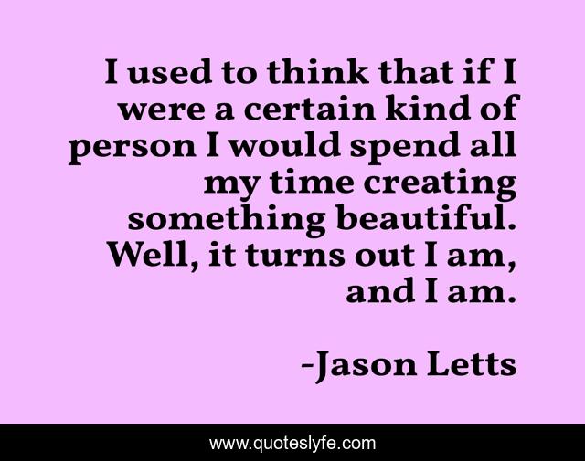 This page presents the quote "I used to think that if I were a certain kind of person I would spend all my time creating something beautiful. Well, it turns out I am, and I am.". Author of this quote is Jason Letts. This quote is about enthusiasm, life, beauty, inspirational, self,.