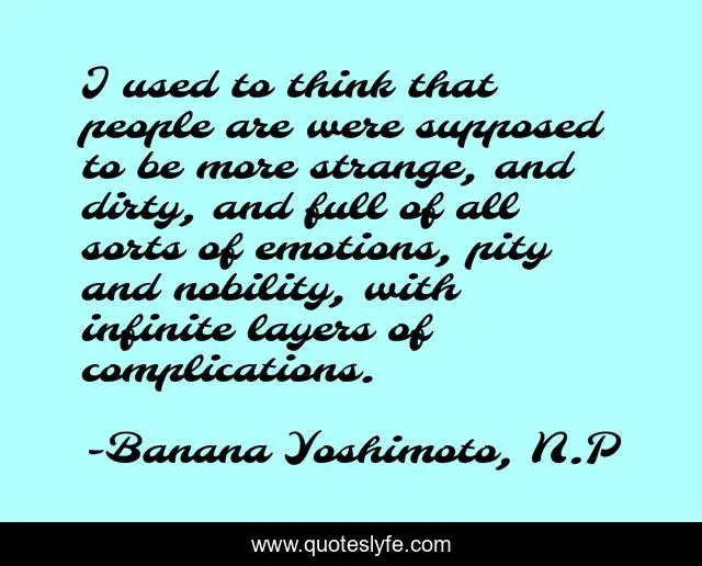 This page presents the quote "I used to think that people are were supposed to be more strange, and dirty, and full of all sorts of emotions, pity and nobility, with infinite layers of complications.". Author of this quote is Banana Yoshimoto, N.P. This quote is about truth-of-life, flaws,.