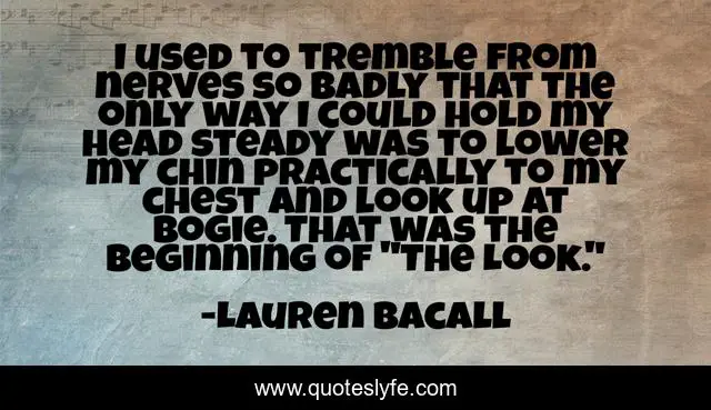 This page presents the quote "I used to tremble from nerves so badly that the only way I could hold my head steady was to lower my chin practically to my chest and look up at Bogie. That was the beginning of "The Look."". Author of this quote is Lauren Bacall. This quote is about uncertainties, doubts,.