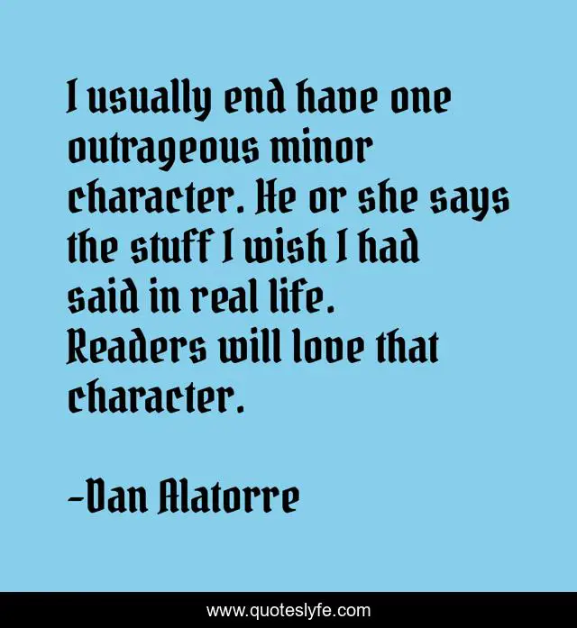 This page presents the quote "I usually end have one outrageous minor character. He or she says the stuff I wish I had said in real life. Readers will love that character.". Author of this quote is Dan Alatorre. .