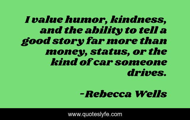 This page presents the quote "I value humor, kindness, and the ability to tell a good story far more than money, status, or the kind of car someone drives.". Author of this quote is Rebecca Wells. This quote is about money, kindness, good,.