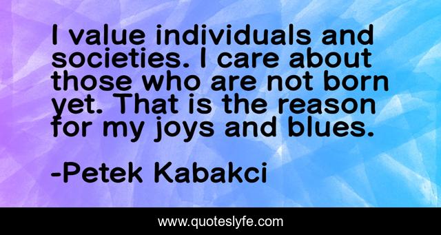 This page presents the quote "I value individuals and societies. I care about those who are not born yet. That is the reason for my joys and blues.". Author of this quote is Petek Kabakci. This quote is about society, individual, value, blues, happiness, blue, joys, future, values,.