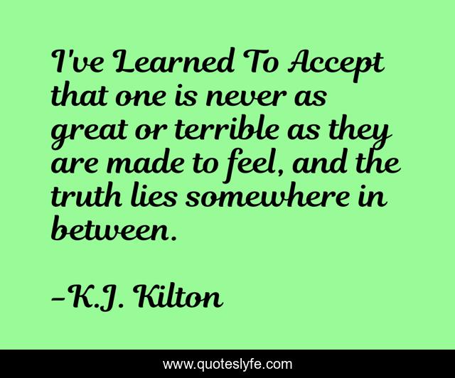 This page presents the quote "I've Learned To Accept that one is never as great or terrible as they are made to feel, and the truth lies somewhere in between.". Author of this quote is K.J. Kilton. This quote is about lies, learned, truth, feelings,.