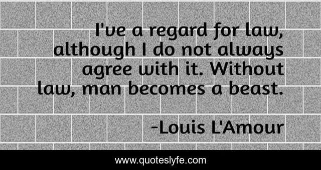 This page presents the quote "I've a regard for law, although I do not always agree with it. Without law, man becomes a beast.". Author of this quote is Louis L'Amour. .