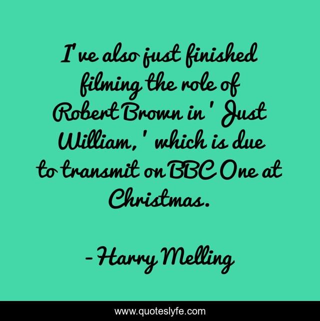 This page presents the quote "I've also just finished filming the role of Robert Brown in 'Just William, ' which is due to transmit on BBC One at Christmas.". Author of this quote is Harry Melling. This quote is about filming, role, just,.