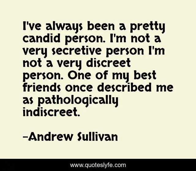 This page presents the quote "I've always been a pretty candid person. I'm not a very secretive person I'm not a very discreet person. One of my best friends once described me as pathologically indiscreet.". Author of this quote is Andrew Sullivan. This quote is about me, candid, friends,.