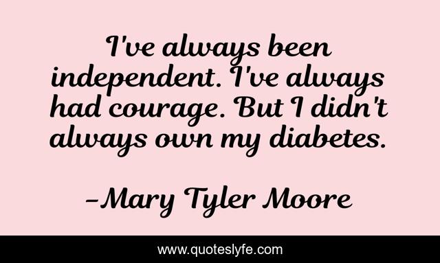 This page presents the quote "I've always been independent. I've always had courage. But I didn't always own my diabetes.". Author of this quote is Mary Tyler Moore. This quote is about independent, diabetes,.