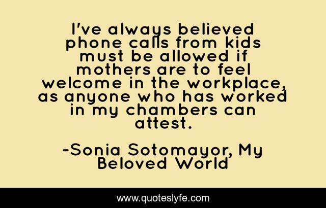 This page presents the quote "I've always believed phone calls from kids must be allowed if mothers are to feel welcome in the workplace, as anyone who has worked in my chambers can attest.". Author of this quote is Sonia Sotomayor, My Beloved World. This quote is about parenting, work,.