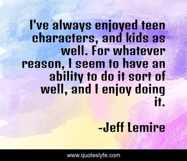This page presents the quote "I've always enjoyed teen characters, and kids as well. For whatever reason, I seem to have an ability to do it sort of well, and I enjoy doing it.". Author of this quote is Jeff Lemire. This quote is about enjoy, kids,.