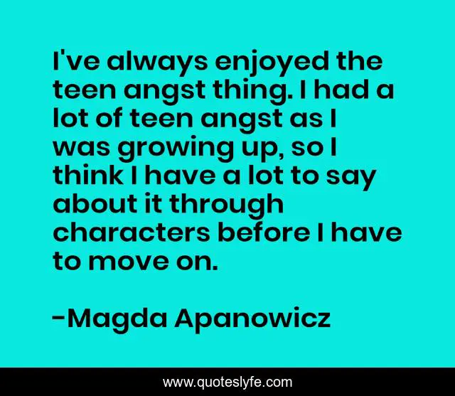 This page presents the quote "I've always enjoyed the teen angst thing. I had a lot of teen angst as I was growing up, so I think I have a lot to say about it through characters before I have to move on.". Author of this quote is Magda Apanowicz. This quote is about growing up, through, think,.