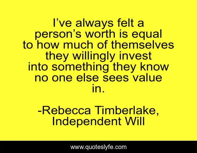 This page presents the quote "I’ve always felt a person’s worth is equal to how much of themselves they willingly invest into something they know no one else sees value in.". Author of this quote is Rebecca Timberlake, Independent Will. This quote is about values-and-beliefs, time-invested, worth,.