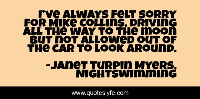 This page presents the quote "I’ve always felt sorry for Mike Collins, driving all the way to the moon but not allowed out of the car to look around.". Author of this quote is Janet Turpin Myers, Nightswimming. This quote is about mike-collins, apollo-11, moon, moonlanding,.