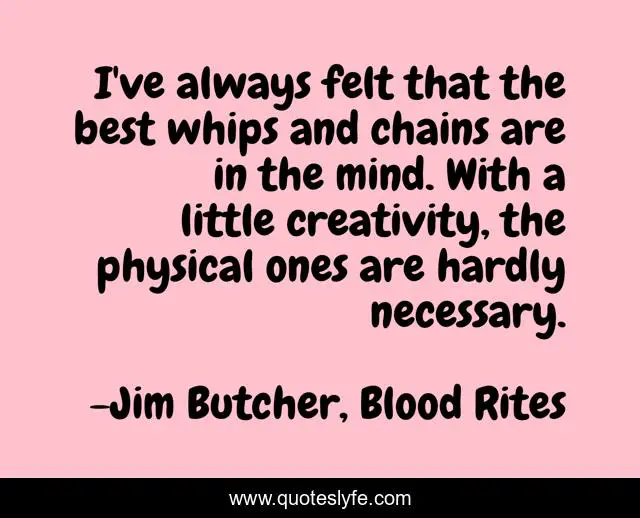 This page presents the quote "I've always felt that the best whips and chains are in the mind. With a little creativity, the physical ones are hardly necessary.". Author of this quote is Jim Butcher, Blood Rites. This quote is about lara-raith, creativity,.