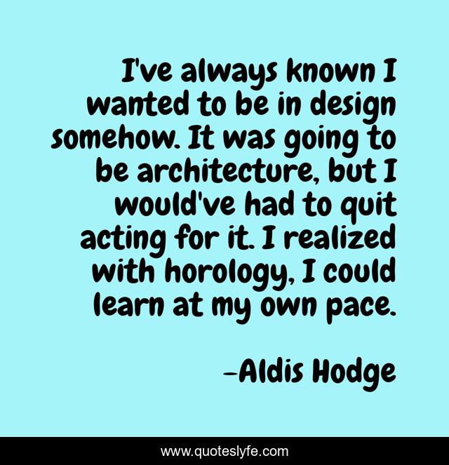 This page presents the quote "I've always known I wanted to be in design somehow. It was going to be architecture, but I would've had to quit acting for it. I realized with horology, I could learn at my own pace.". Author of this quote is Aldis Hodge. This quote is about acting, design, learn,.