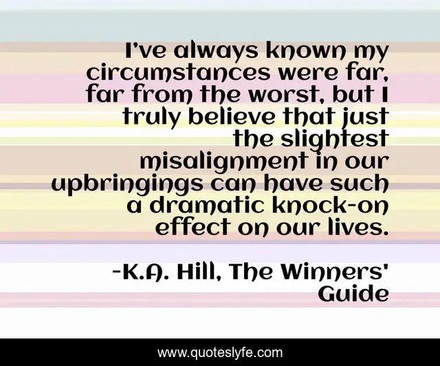 This page presents the quote "I’ve always known my circumstances were far, far from the worst, but I truly believe that just the slightest misalignment in our upbringings can have such a dramatic knock-on effect on our lives.". Author of this quote is K.A. Hill, The Winners' Guide. This quote is about dramatic-effect, misalignment, upbringing, upbringings, growing-up, circumstances,.