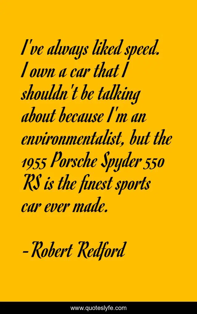 This page presents the quote "I've always liked speed. I own a car that I shouldn't be talking about because I'm an environmentalist, but the 1955 Porsche Spyder 550 RS is the finest sports car ever made.". Author of this quote is Robert Redford. This quote is about car, speed, always,.