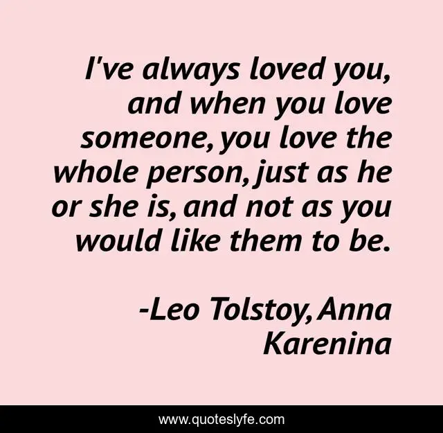 This page presents the quote "I've always loved you, and when you love someone, you love the whole person, just as he or she is, and not as you would like them to be.". Author of this quote is Leo Tolstoy, Anna Karenina. This quote is about anna-karenina, tolstoy, love, affection,.