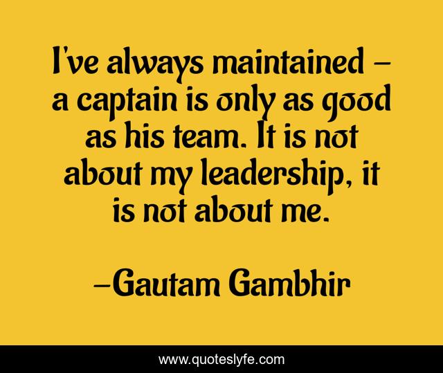 This page presents the quote "I've always maintained - a captain is only as good as his team. It is not about my leadership, it is not about me.". Author of this quote is Gautam Gambhir. This quote is about me, good, team,.