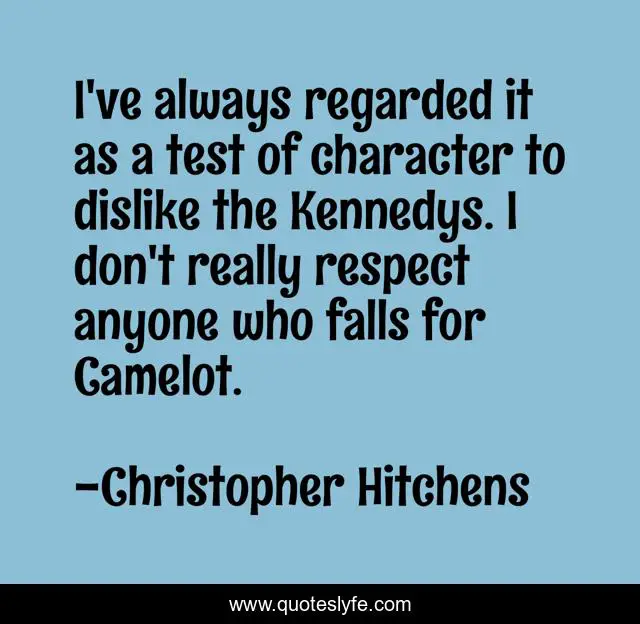 This page presents the quote "I've always regarded it as a test of character to dislike the Kennedys. I don't really respect anyone who falls for Camelot.". Author of this quote is Christopher Hitchens. This quote is about camelot, kennedy-family, character, american-politics, united-states, gore-vidal,.