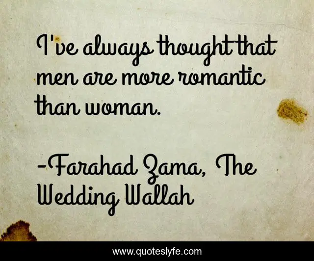 This page presents the quote "I've always thought that men are more romantic than woman.". Author of this quote is Farahad Zama, The Wedding Wallah. .