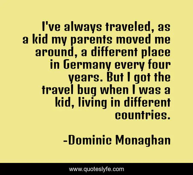 This page presents the quote "I've always traveled, as a kid my parents moved me around, a different place in Germany every four years. But I got the travel bug when I was a kid, living in different countries.". Author of this quote is Dominic Monaghan. This quote is about me, living, parents,.