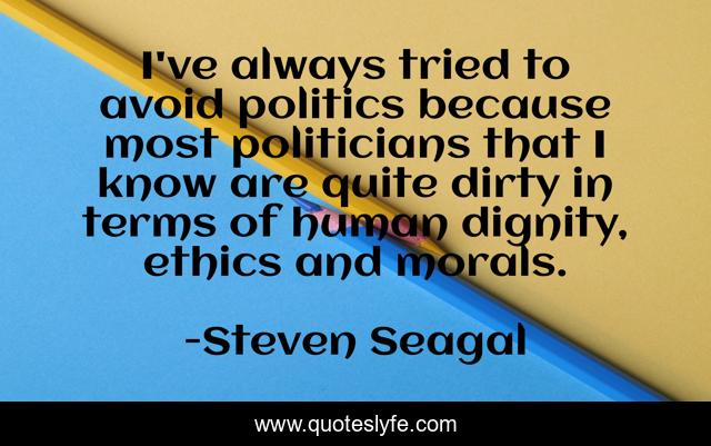 This page presents the quote "I've always tried to avoid politics because most politicians that I know are quite dirty in terms of human dignity, ethics and morals.". Author of this quote is Steven Seagal. This quote is about dignity, ethics,.