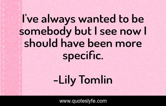 This page presents the quote "I've always wanted to be somebody but I see now I should have been more specific.". Author of this quote is Lily Tomlin. .