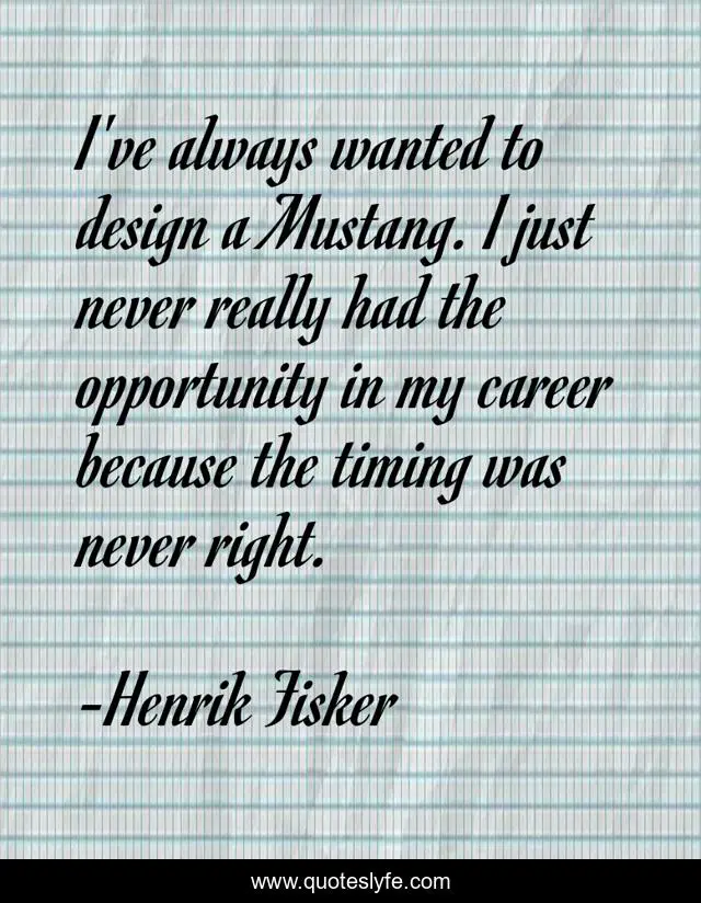 This page presents the quote "I've always wanted to design a Mustang. I just never really had the opportunity in my career because the timing was never right.". Author of this quote is Henrik Fisker. This quote is about timing, career, opportunity,.