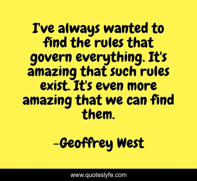 This page presents the quote "I've always wanted to find the rules that govern everything. It's amazing that such rules exist. It's even more amazing that we can find them.". Author of this quote is Geoffrey West. This quote is about rules, always, find,.