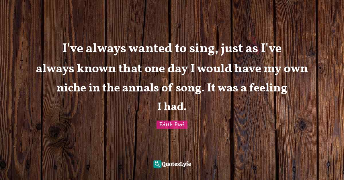 This page presents the quote "I've always wanted to sing, just as I've always known that one day I would have my own niche in the annals of song. It was a feeling I had.". Author of this quote is Edith Piaf. This quote is about niche, song, one day, my own, known, wanted, feelings,.