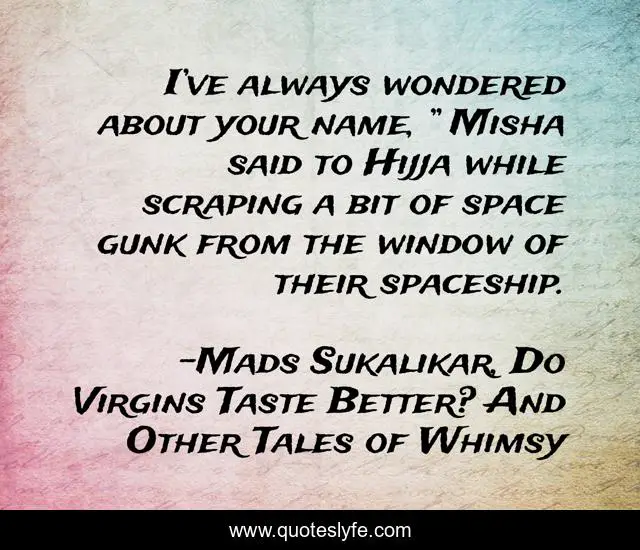 "Mads Sukalikar, Do Virgins Taste Better? And Other Tales of Whimsy Quotes." Quoteslyfe.com, 2025. Fri. 05 Dec. 2025. <https://www.quoteslyfe.com/quote/I-ve-always-wondered-about-your-name-157279>.