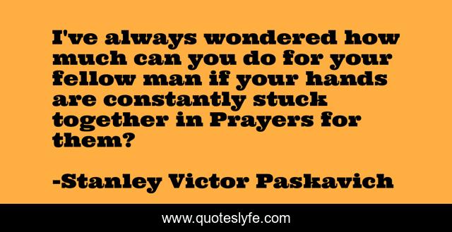 This page presents the quote "I've always wondered how much can you do for your fellow man if your hands are constantly stuck together in Prayers for them?". Author of this quote is Stanley Victor Paskavich. This quote is about churches, life, prayers, religion,.