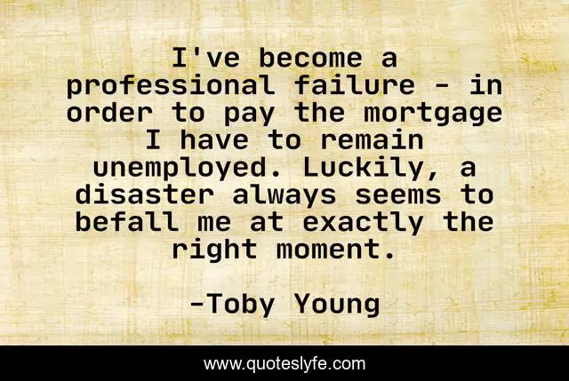 This page presents the quote "I've become a professional failure - in order to pay the mortgage I have to remain unemployed. Luckily, a disaster always seems to befall me at exactly the right moment.". Author of this quote is Toby Young. This quote is about me, professional, moment,.