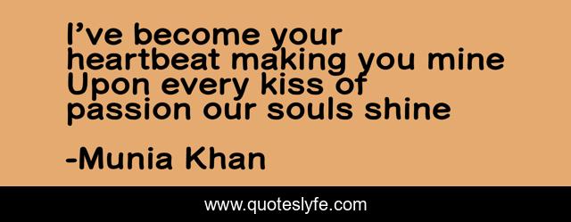 This page presents the quote "I’ve become your heartbeat making you mine Upon every kiss of passion our souls shine". Author of this quote is Munia Khan. This quote is about lovers, love, souls, kisses, mine, soul, passion, kiss, kissing,.