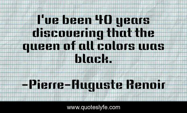 This page presents the quote "I've been 40 years discovering that the queen of all colors was black.". Author of this quote is Pierre-Auguste Renoir. This quote is about color, art, black, inspirational, enthusiasm,.