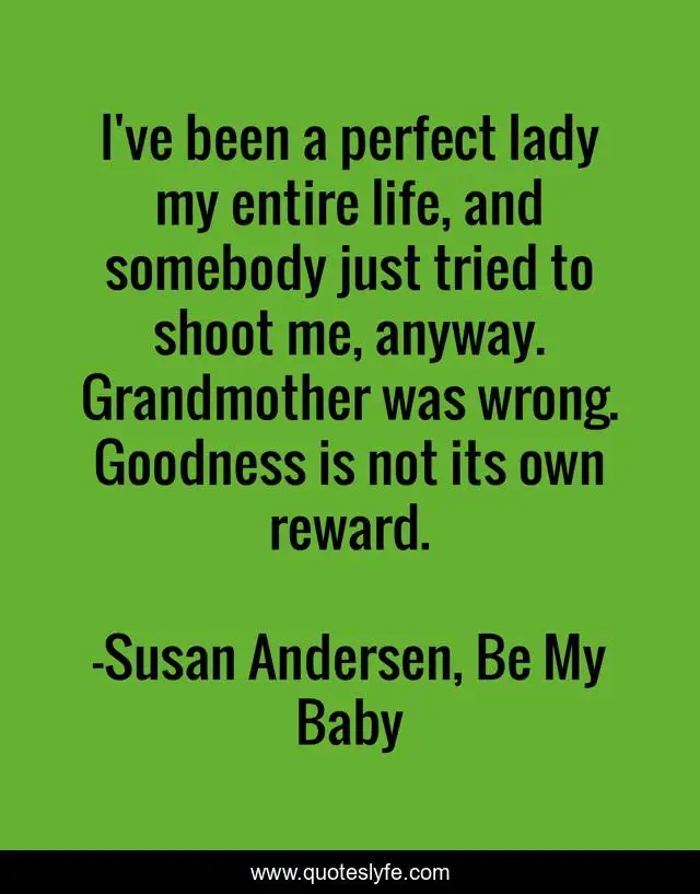 This page presents the quote "I've been a perfect lady my entire life, and somebody just tried to shoot me, anyway. Grandmother was wrong. Goodness is not its own reward.". Author of this quote is Susan Andersen, Be My Baby. This quote is about good, behavior, advice, goodness, reward, lady,.