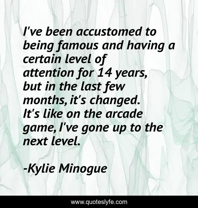 This page presents the quote "I've been accustomed to being famous and having a certain level of attention for 14 years, but in the last few months, it's changed. It's like on the arcade game, I've gone up to the next level.". Author of this quote is Kylie Minogue. This quote is about game, attention, years,.